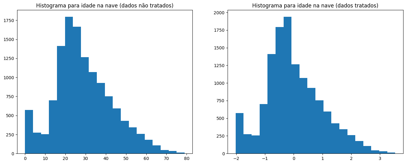 O primeiro histograma mostra a comparação de como era a distribuição das idades ANTES do tratamento dos dados e como ficou APÓS o tratamento.
