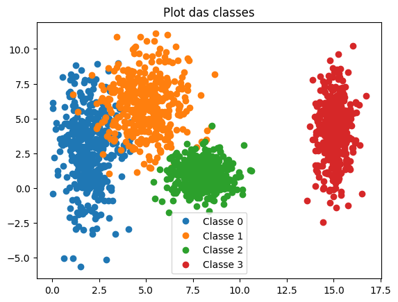 A imagem a seguir mostra o plot dos pontos gerados em para cada uma das classes, diferenciadas pela cor.
